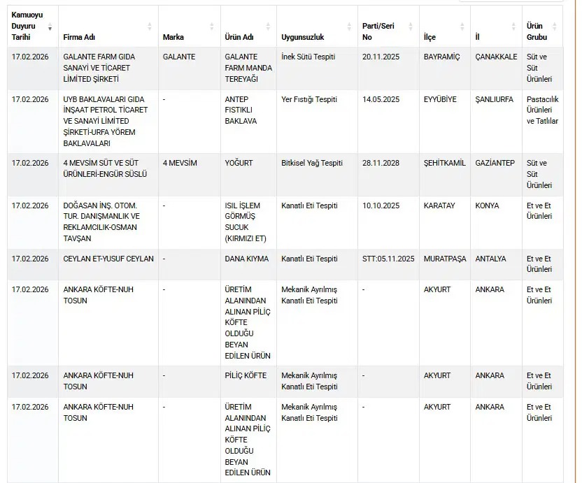 Listeye toplam 54 yeni ürün eklenirken, 6’sı sağlığı tehlikeye düşürecek ürünler arasında bulunuyor. Bu kapsamda kıyma, zeytinyağı, tereyağı ve sucuk gibi günlük hayatta sıkça tüketilen ürünlerde uygunsuzluklar tespit edildi.