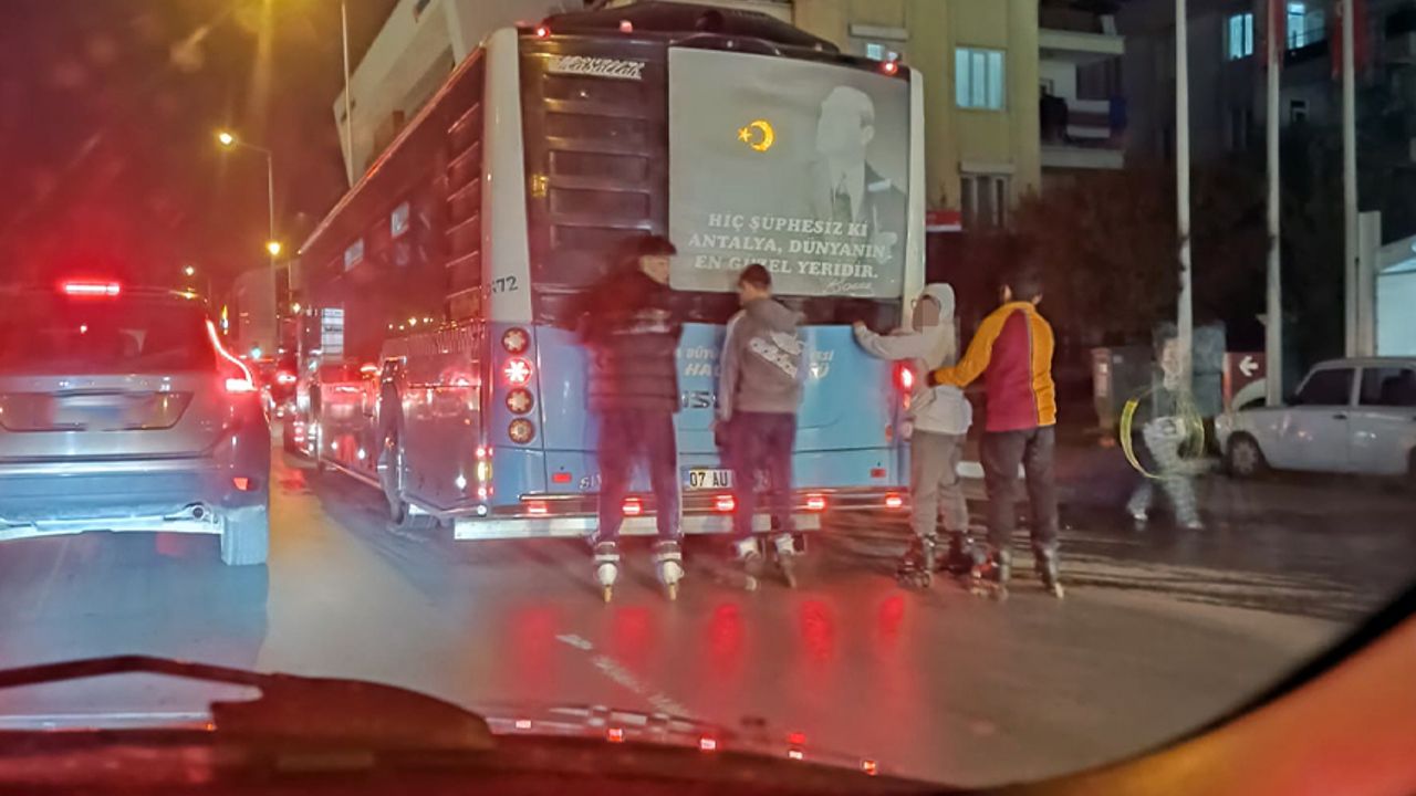 Antalya'nın Kepez ilçesine bağlı Gazi Bulvarı’nda dün gece saatlerinde 4 patenli çocuk, seyir halindeki bir belediye yolcu otobüsünün arkasına tutunarak yolculuk yaptı. Trafiğin yoğun olduğu saatlerde ana arter üzerinde gerçekleşen olay, çevredeki sürücülerin dikkatini çekti.