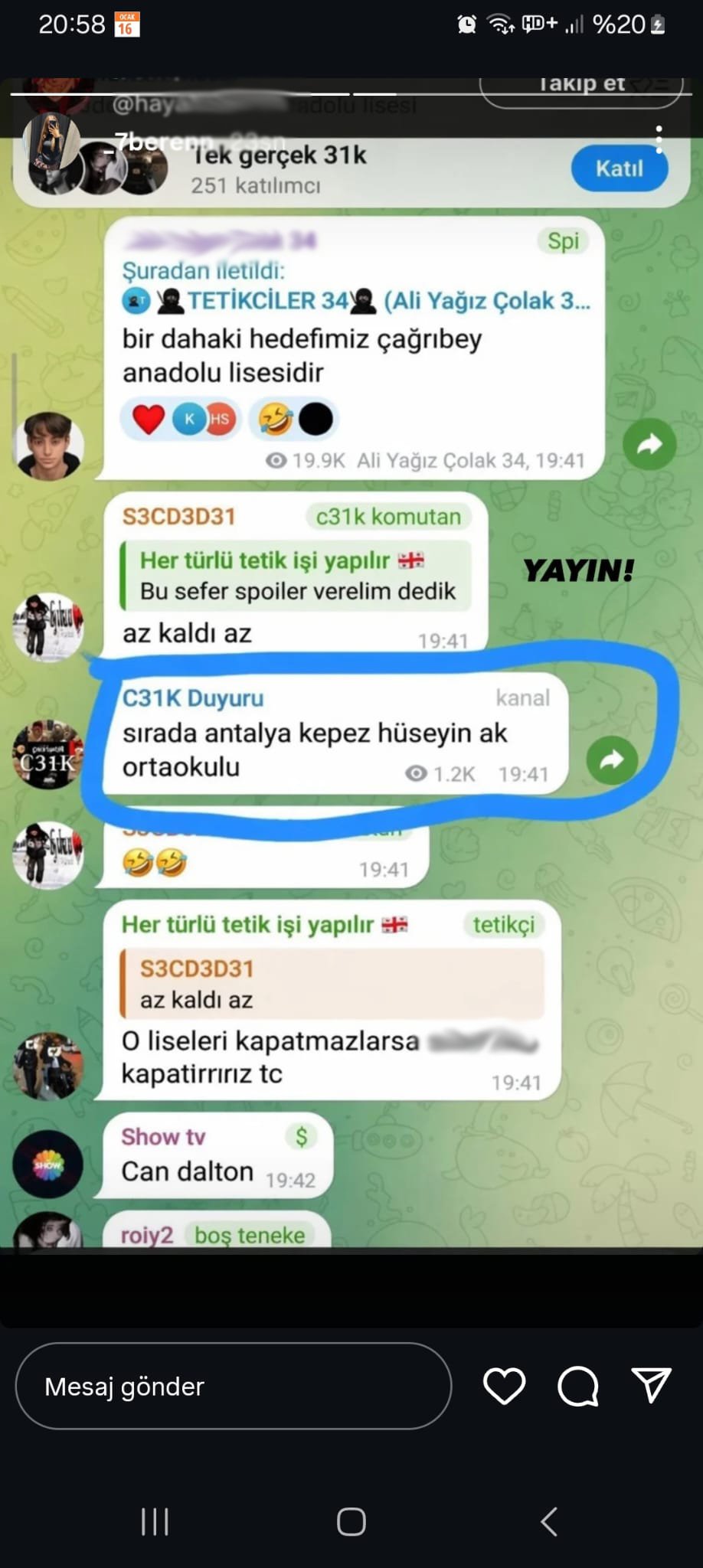 Bir anlık mesajlaşma uygulamasında kurulan grupta ‘spoiler verelim dedik’, ‘sıra sizde’, ‘sırada Antalya Kepez Hüseyin Ak Ortaokulu var’ gibi ifadelerin yer aldığı görüldü. Mesajlarda sık sık argo ifadeler olması da dikkat çekti