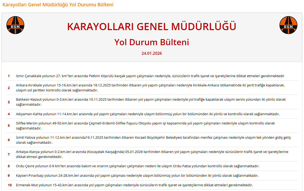 KARAYOLLARI Genel Müdürlüğü'nün (KGM) paylaştığı güncel yol durum bültenine göre, Antalya ve çevresindeki birçok önemli güzergahta yol yapım, bakım ve onarım çalışmaları devam ediyor. Sürücülerin güvenli seyahat etmeleri adına uyarıların yapıldığı bültende tünel çalışmalarından heyelan sonrası düzenlemelere kadar ulaşımı doğrudan etkileyen birçok nokta yer alıyor. İşte Antalya ve çevresinde 24 Ocak 2026'da trafiğe çıkacak sürücülerin dikkat etmesi gereken güzergahlar...