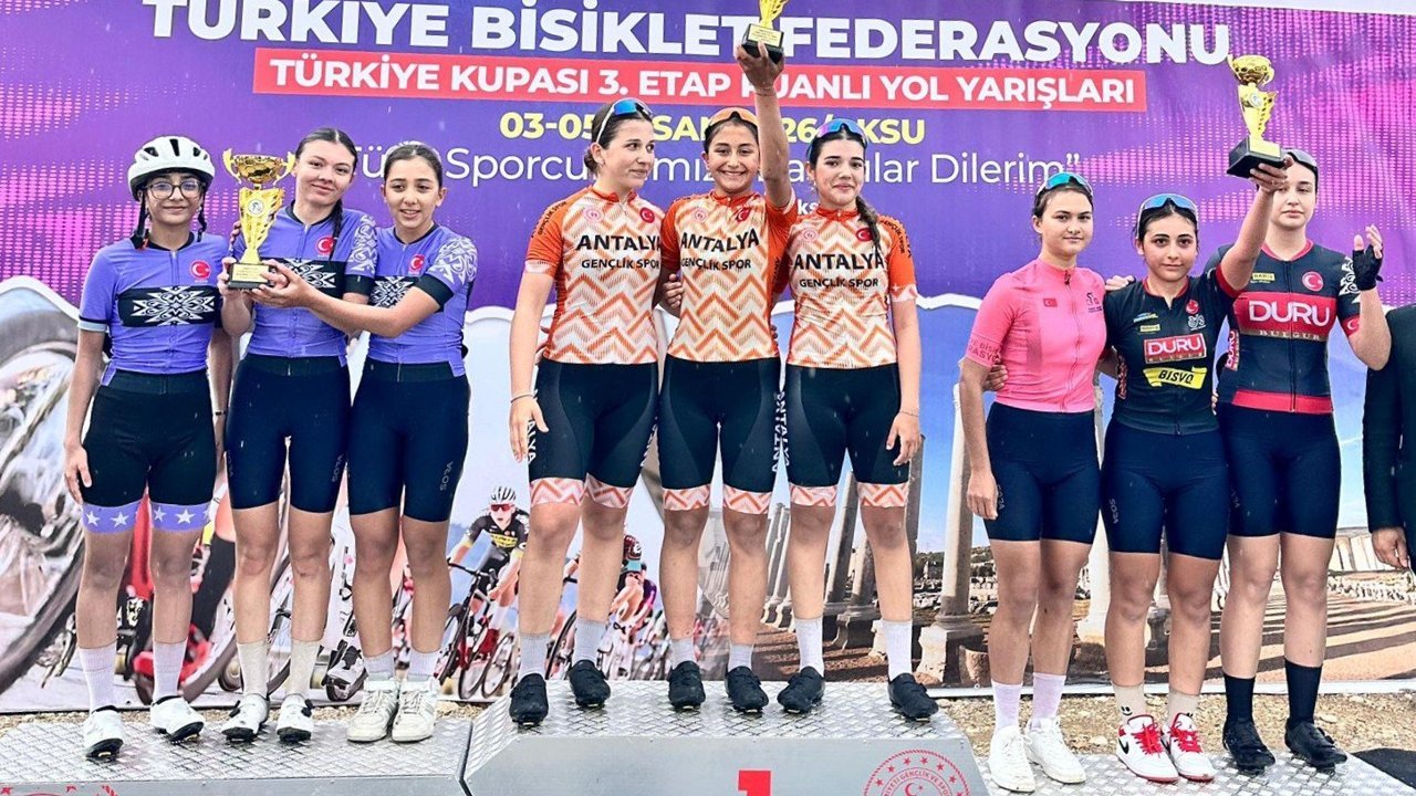 Antalya Spor Lisesi öğrencileri, Aksu’da 3-5 Nisan tarihlerinde düzenlenen U17 Kız Bisiklet Türkiye Kupası 3. Etap Puanlı Yol Yarışları’nda hem bireysel hem de takım performanslarıyla dikkat çekti. Emine Ahsen Akgün, Ecrin Ece Gültekin ve Azra Aydın’dan oluşan ekip, zorlu parkuru başarıyla tamamlayarak takım kategorisinde Türkiye şampiyonu oldu. Yarış boyunca büyük mücadele sergileyen öğrenciler, rakiplerini geride bırakarak kürsünün en üst basamağına çıktı. Genç sporcular, Türkiye genelindeki güçlü rakiplerini geride bırakırken, Antalya’nın spordaki genç yetenek potansiyelini de gözler önüne serdi.
