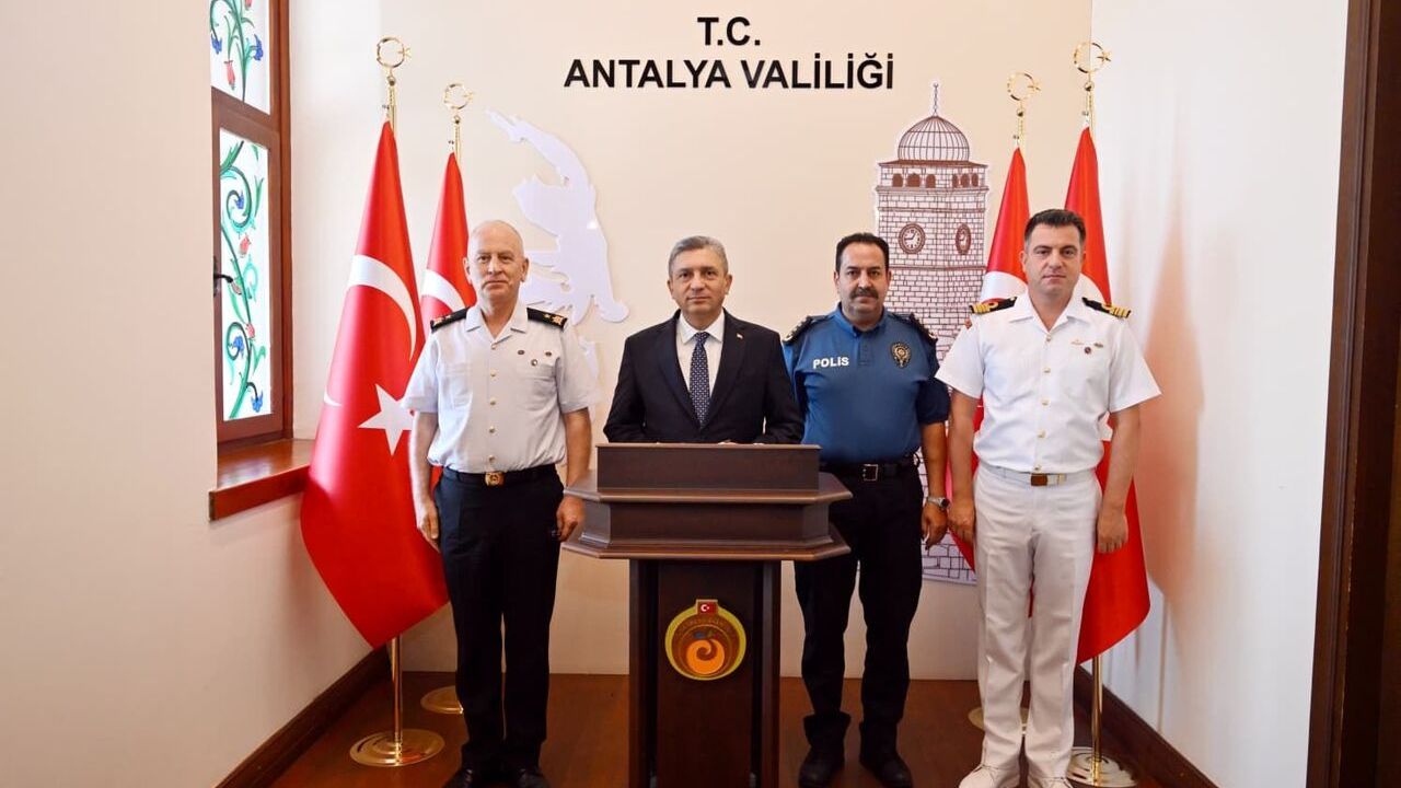 Antalya Valiliği Hükümet Konağı’nda gerçekleştirilen Basın Bilgilendirme Toplantısı’nda, Antalya Valisi Hulusi Şahin’e İl Jandarma Komutanı Tuğgeneral Tarık Hekimoğlu, İl Emniyet Müdürü İlker Arslan ve Sahil Güvenlik Grup Komutanı Yarbay Tolga Coşkun eşlik etti.