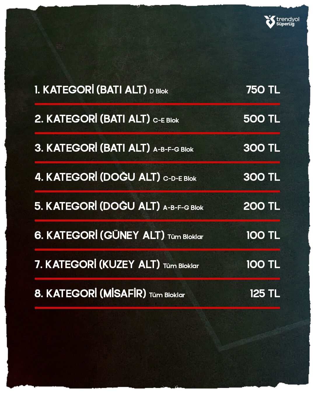 Antalyaspor yönetimi tarafından açıklanan bilet fiyatları, her bütçeye uygun seçeneklerle taraftarların beğenisine sunuldu. En düşük bilet fiyatı 100 TL olarak belirlenirken en yüksek bilet fiyatı ise 750 TL oldu. İşte Antalyaspor-Gaziantep FK maçının bilet fiyatları...