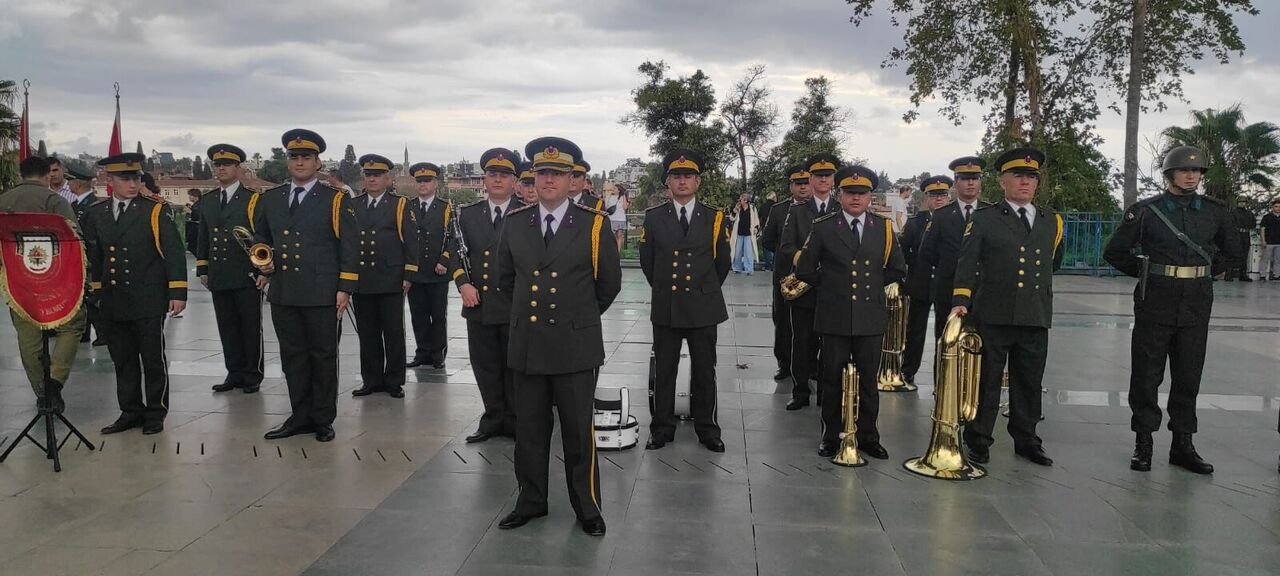 Antalya Valisi Hulusi Şahin, Antalya Garnizon Komutanı Tümgeneral Sinan Eren ve Antalya Büyükşehir Belediye Başkan Vekili Büşra Özdemir’in çelenk bıraktı.