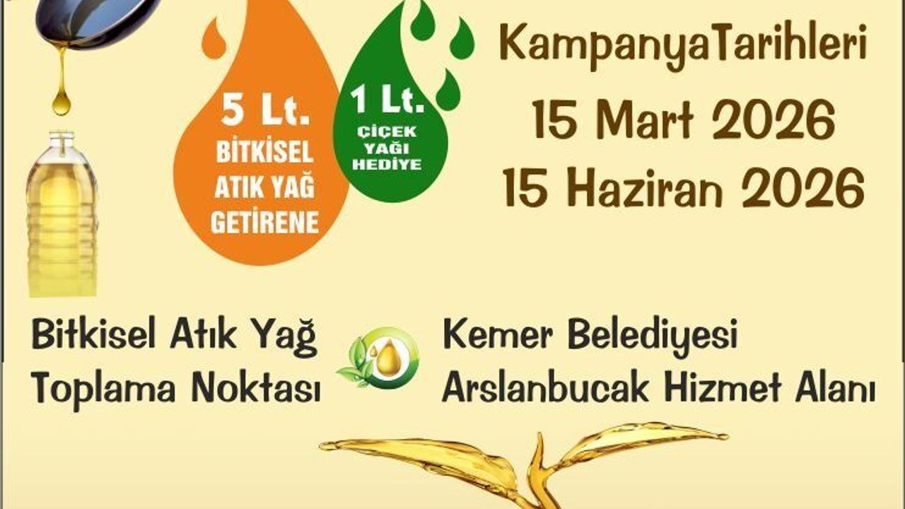 15 Mart – 15 Haziran 2026 tarihleri arasında geçerli olacak kampanya kapsamında vatandaşlar, biriktirdikleri bitkisel atık yağları Kemer Belediyesi İklim Değişikliği ve Sıfır Atık Müdürlüğü’ne teslim ederek hem çevreyi koruyacak hem de 1 litre bitkisel yağ hediyesinden yararlanabilecek.