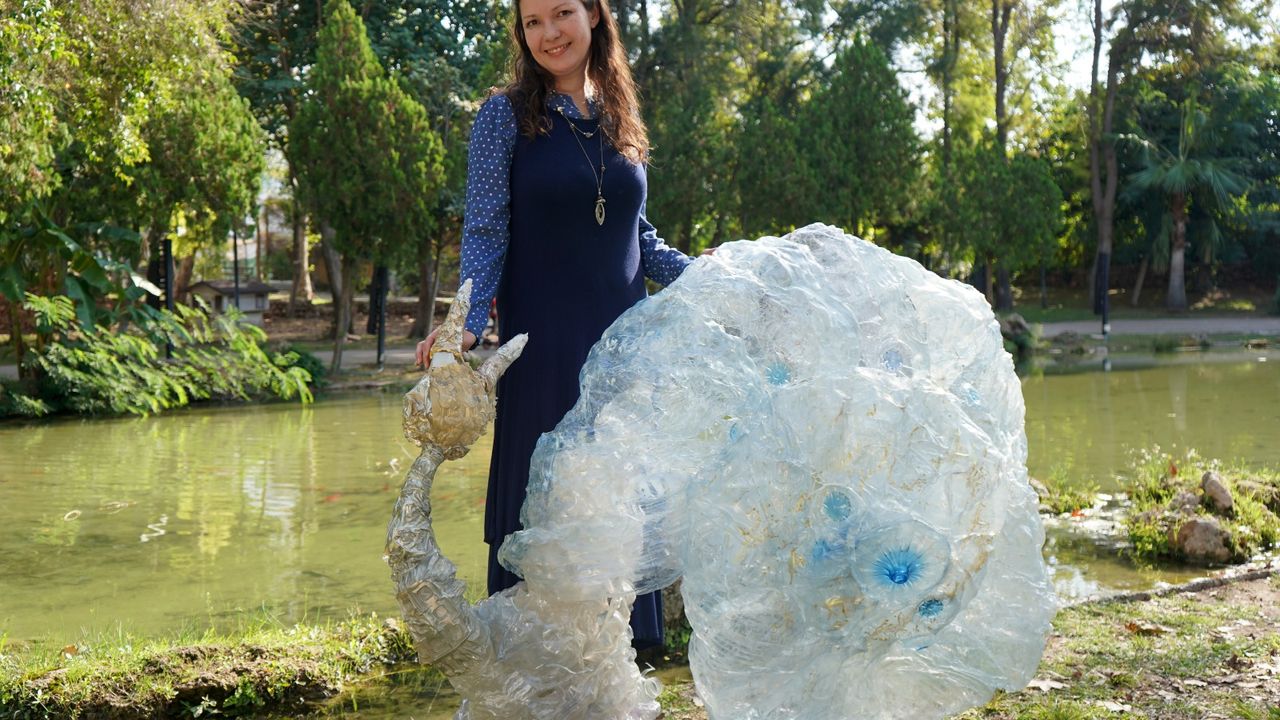 Geri dönüşüm atıklarından yeni oluşturduğu heykeli de anlatan Amirova, “Altın renkli salyangoz figürümü bulaşık deterjanı şişelerinden yaptım. Çünkü artık her şeyin güzel bir yanı var" ifadelerini kullandı.