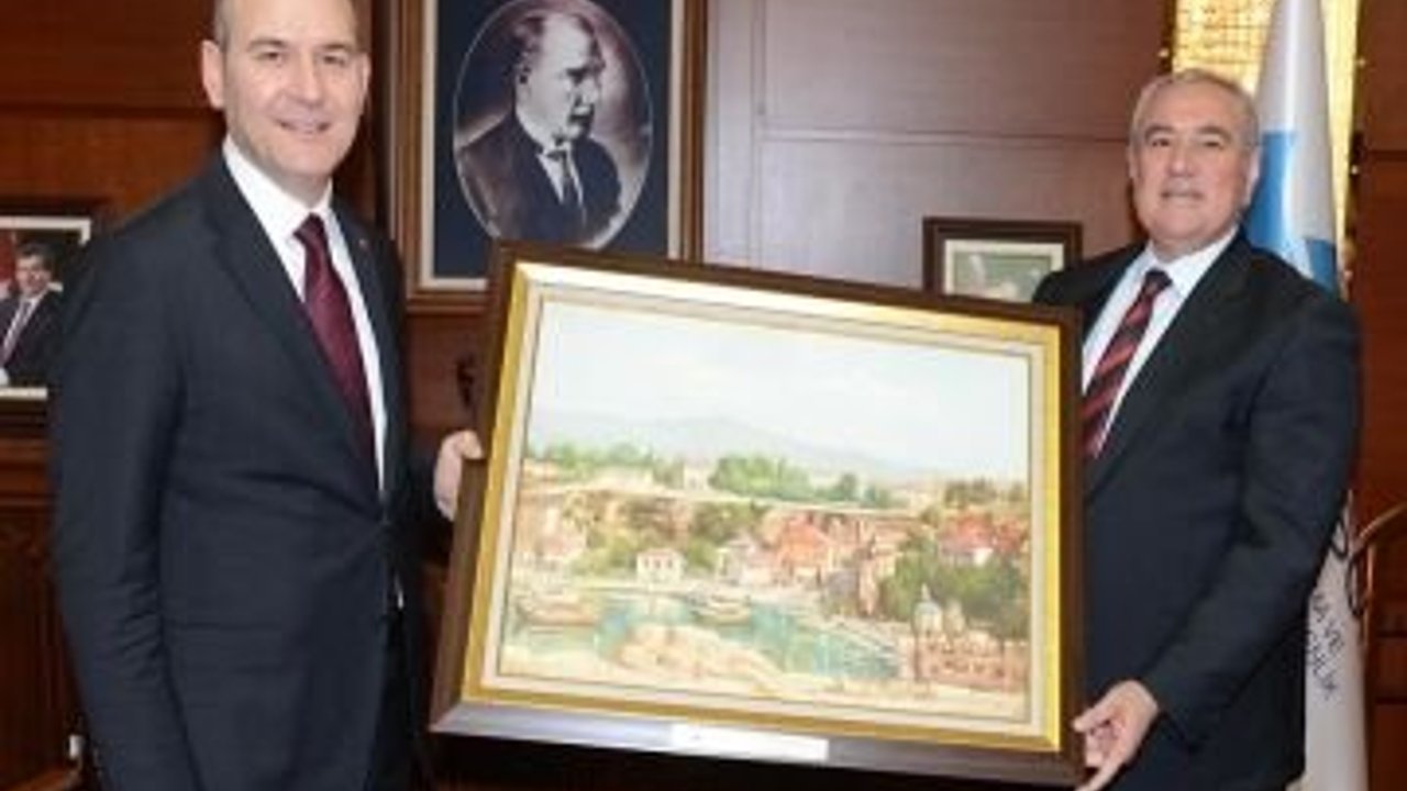 ATSO Başkanı Davut Çetin, ziyaretin anısına Bakan Soylu'ya yağlı boya Antalya tablosu ile ATSO Tarihi ve Antalya Tanıtım kitabı hediye etti.