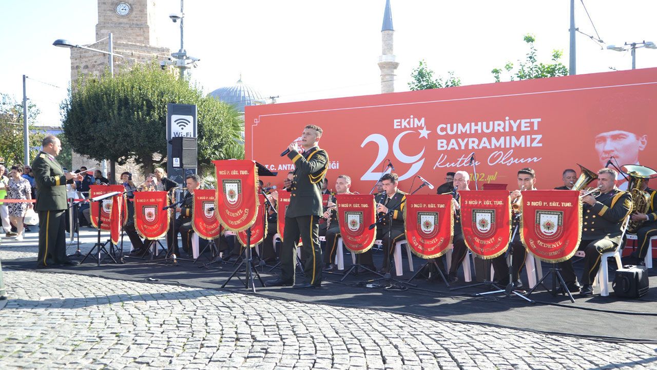 Kutlama programının etkinliklerinden biri olan konserde, Antalya halkı Cumhuriyet coşkusunu marşlar ve ezgiler eşliğinde yaşadı. Vatandaşların yoğun ilgi gösterdiği etkinlikte, Antalyalılar, bandonun seslendirdiği eserleri coşkuyla eşlik etti.