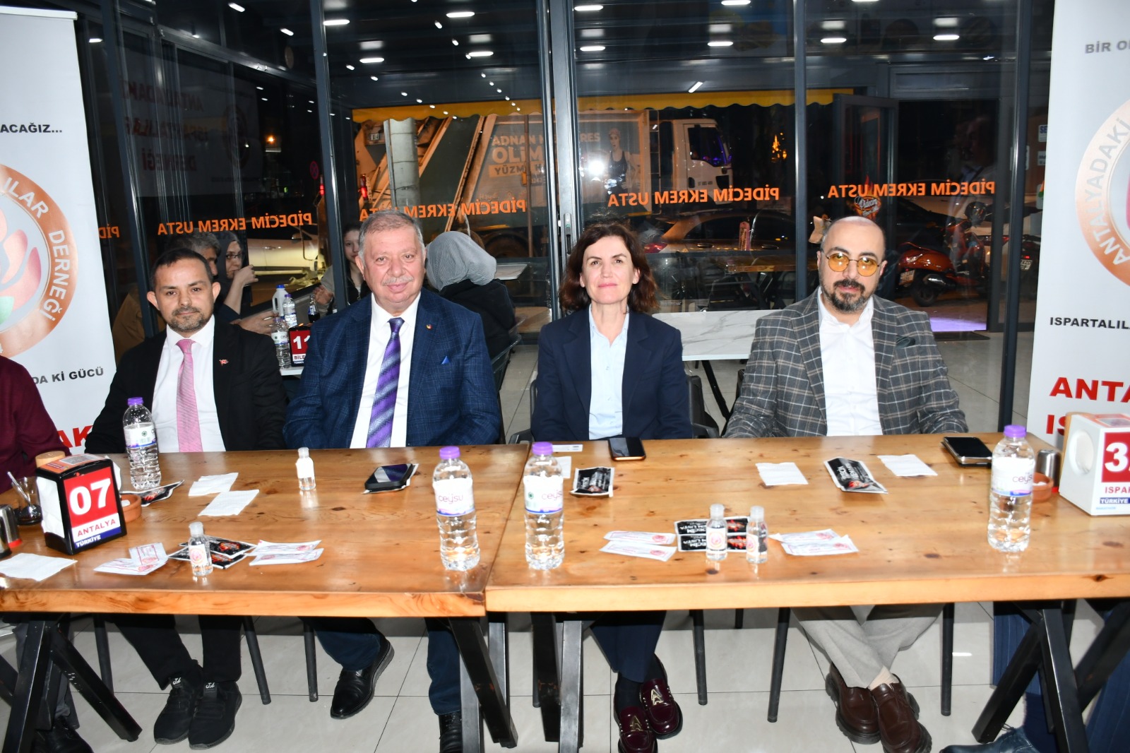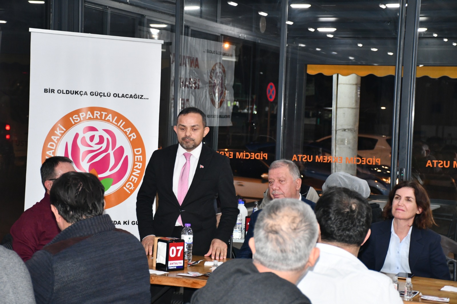 Antalya’daki Ispartalılar Derneği (ANIDER), kentte bir toplantı düzenledi. Toplantıya CHP Antalya Milletvekili Aliye Coşar, Isparta Ticaret ve Sanayi Odası (ITSO) Başkanı Metin Çelik, ITSO Başkan Yardımcısı Şakir Uygun, Isparta Girişimci ve Sanayici İş İnsanları Derneği (IGSİAD) Başkanı Kubilay Kapı ile çok sayıda dernek üyesi katıldı. “Güç birliği ve çözüm” mesajlarının öne çıktığı gecede, Dereboğazı Yolu ve hızlı tren gibi bölgeyi yakından ilgilendiren kronik sorunlar için “ortak ses” çağrısı yapıldı.