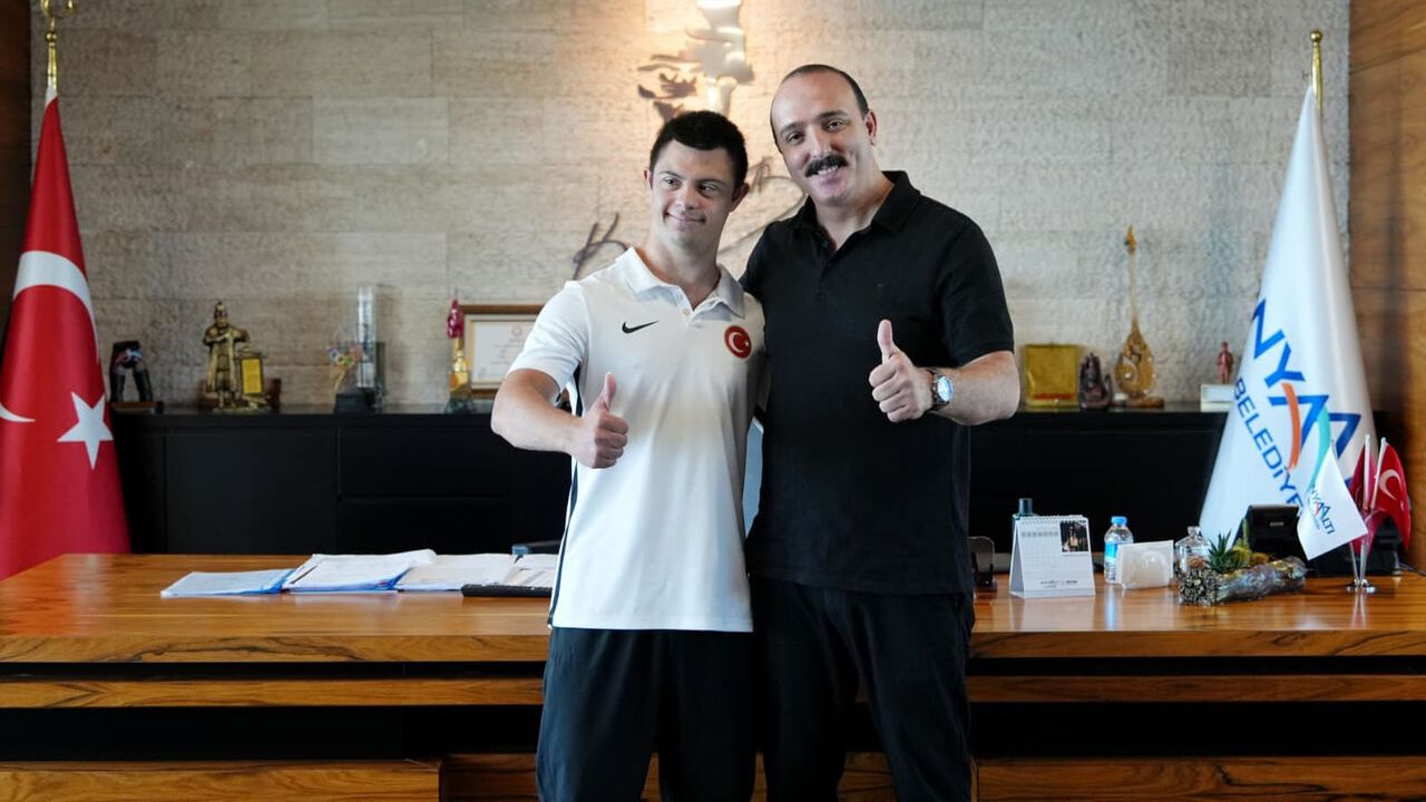 Konyaaltı Belediye Başkanı Cem Kotan, down sendromlu milli yüzücü Alperen Menç ve ailesini makamında ağırladı. Her fırsatta spora ve sporculara destek verdiklerine vurgulayan Başkan Kotan, Konyaaltı'nda gerçekleştirdikleri spor faaliyetlerini Alperen Menç'e anlattı. Başkan Kotan, Alperen Menç'in spor alanındaki azmi ve başarılarının herkese örnek olduğunu belirterek, milli sporcuya başarılar diledi.