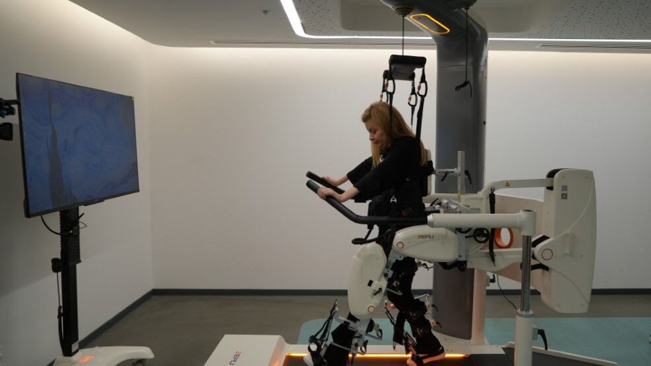 Yürümeye yardımcı robot ile yapay zeka destekli simülasyona bakarak yürüyüş yapan Karaburun, simülasyondaki yürüyüş yapan kız çocuğunun kendisine benzediğini bu sebeple bu simülasyonu tercih ettiğini söyledi.