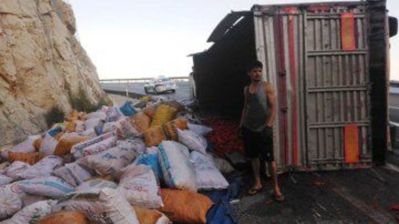 Kazada, TIR'da bulunan 22 ton biberin yaklaşık 10 tonu kullanılmayacak hale geldi. TIR'ın kaldırılması ve biberlerin toplanmasının ardından yol trafiğe açıldı. (DHA)