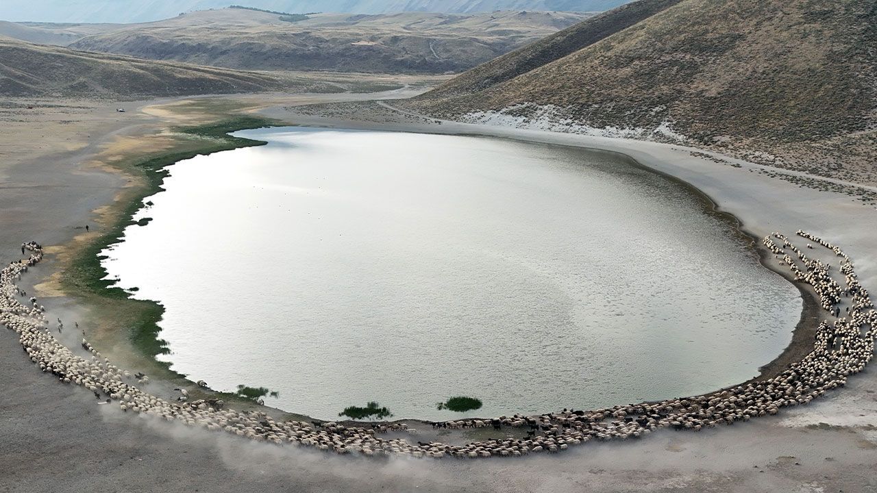 Nemrut Dağı'nda yer alan ve doğal güzelliğiyle dikkat çeken Kalp Gölü, her yıl olduğu gibi bu yıl da binlerce küçükbaş hayvana ev sahipliği yapıyor. Sıcak yaz günlerinde su ihtiyaçlarını karşılamak için göle doğru ilerleyen koyun sürüleri, tozlu yollar ve vadilerden geçerken kartpostallık görüntüler oluşturdu. Özellikle sabah saatlerinde ve gün batımında oluşan manzaralar, görenleri hayran bıraktı.