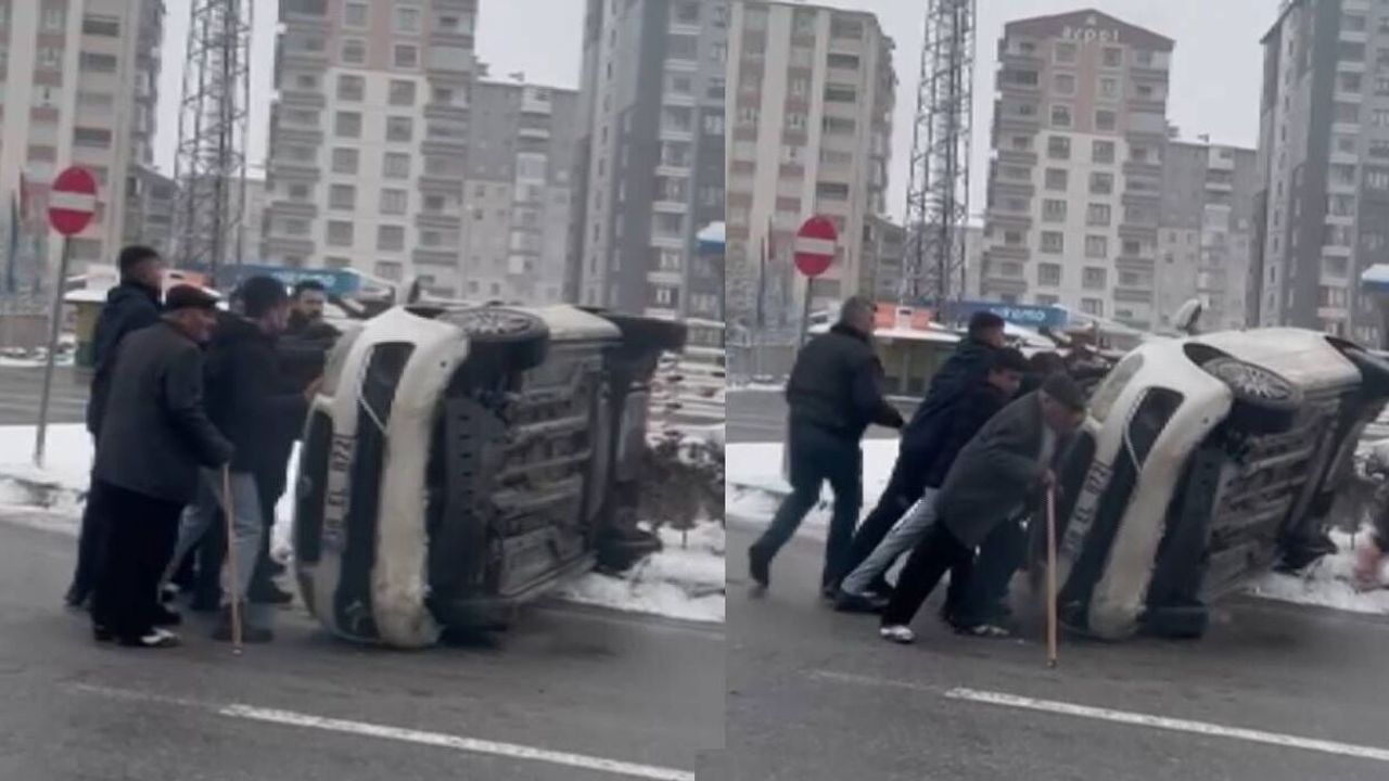 Vatandaşlar bir süre otomobilin kapısını açmaya çalışırken, sonuç alamadı. İçerisinde bulunanlara aldırış etmeden iterek aracı düzelten vatandaşlar şahısları çıkardı.