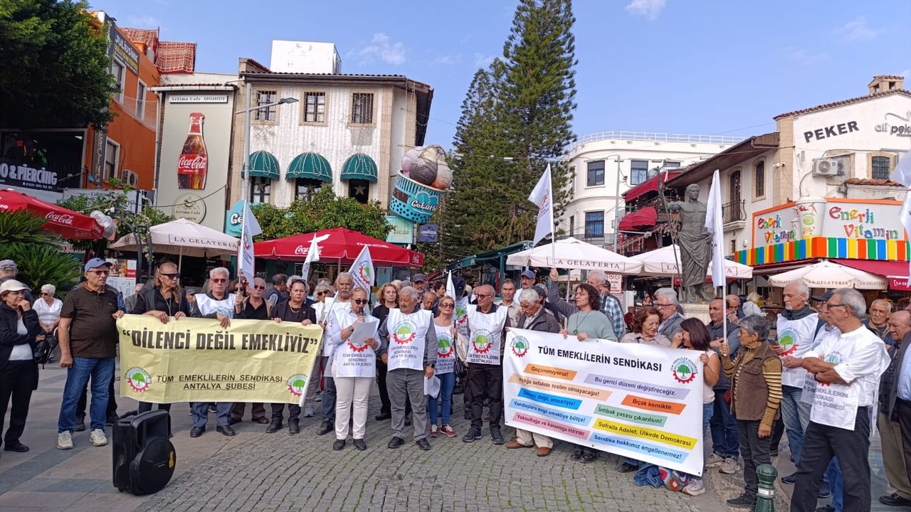 İktidarın verdiği bütçe teklifine karşı eylem yapan emekliler, Antalya’nın Muratpaşa ilçesinde bulunan Attalos Meydanı’nda toplandı. Eylemde konuşan Tüm Emekliler Sendikası Antalya Şube Sekreteri Ferzan Sarsılmaz, “İktidarın açıkladığı 2026 yılı bütçe teklifi, sefaletimizin derinleşerek sürdürüleceğinin habercisidir. Açıklanan OVP programı ve yeni bütçe teklifinde, emekliler için hiçbir iyileştirme olmayacağı gibi, yaşamda karşılığı olmayan, baskılanmış TÜİK verilerinin bile aranacağı açıktır. Kaynak dağılımında açık biçimde sermayeye ve faize cömert davranılmışken, çalışanlara ve emekliye zırnık yoktur. Öngördükleri yıllık enflasyon tıpkı önceki yıllar gibi TÜİK’in çabalarına rağmen tutmamıştır. İlk başta 2025 yılı enflasyonunu yüzde 21 olarak öngörmüşlerdi. Şimdiden öngörülerinden en az yüzde 45-50 arasında sapma olacağı kesinleşmiştir. Çetelere değil, emekliye bütçe istiyoruz” dedi.