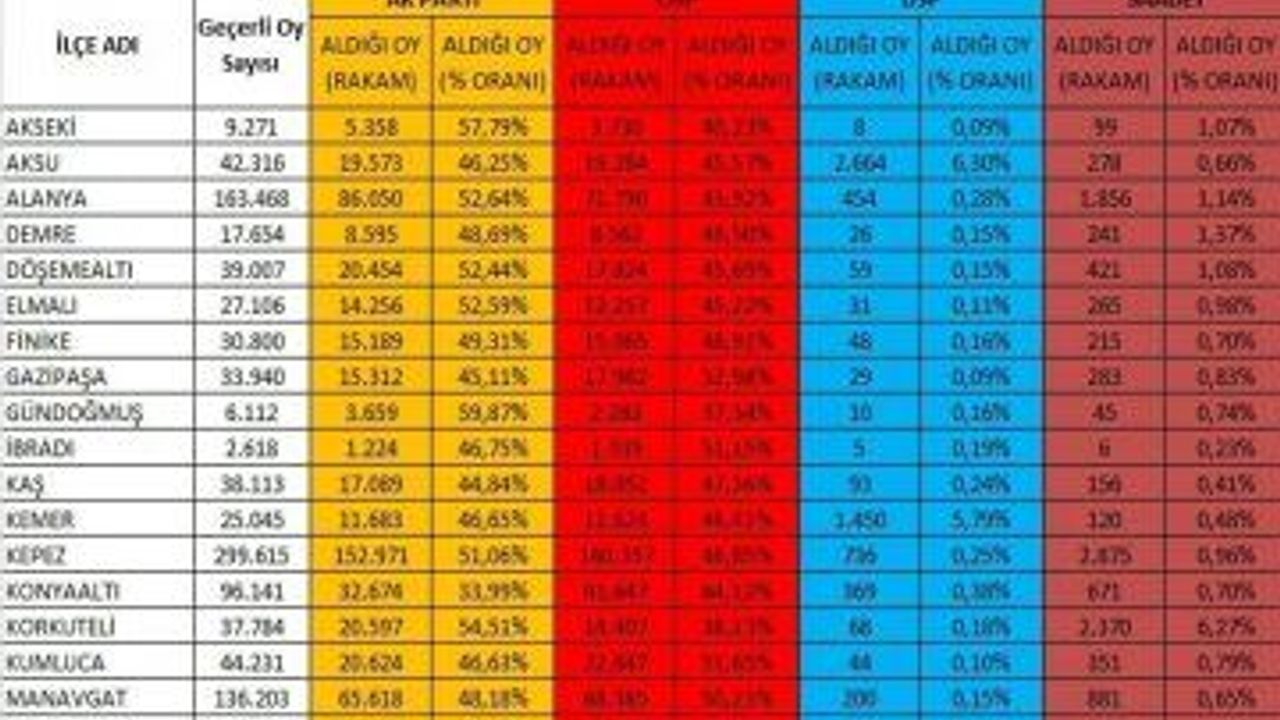 Muhittin Böcek, Konyaaltı, Muratpaşa, Manavgat, Kumluca, Serik, Kaş, İbradı ve Gazipaşa'da rakibi Türel'den fazla oy aldı. Böcek en büyük farkı 64 bin 239 fazla oyla Muratpaşa'da yakalarken Menderes Türel rakibine en büyük oy farkını 14 bin 260 oyla Alanya ilçesinde elde etti. Deniz TOPKAYA