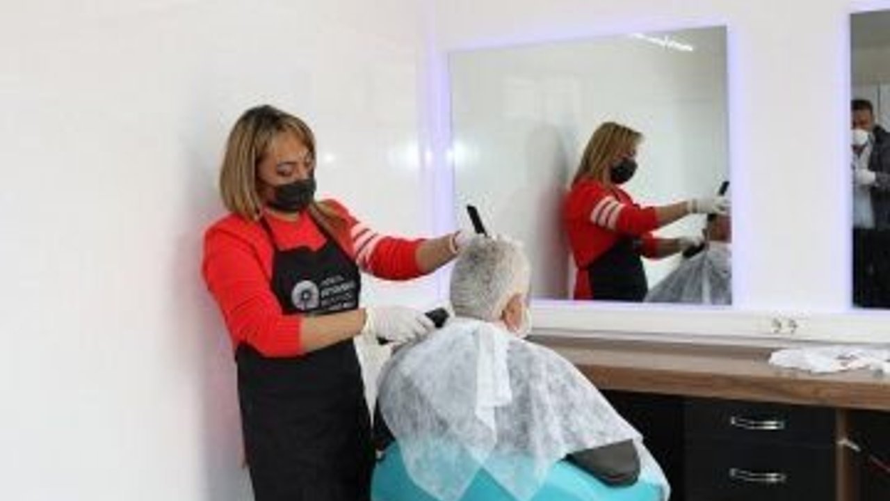 Korona tedbirleri kapsamında sosyal mesafe ve hijyen kuralları çerçevesinde verilen kuaförlük hizmetin vatandaşlar memnun kaldı. (İHA)