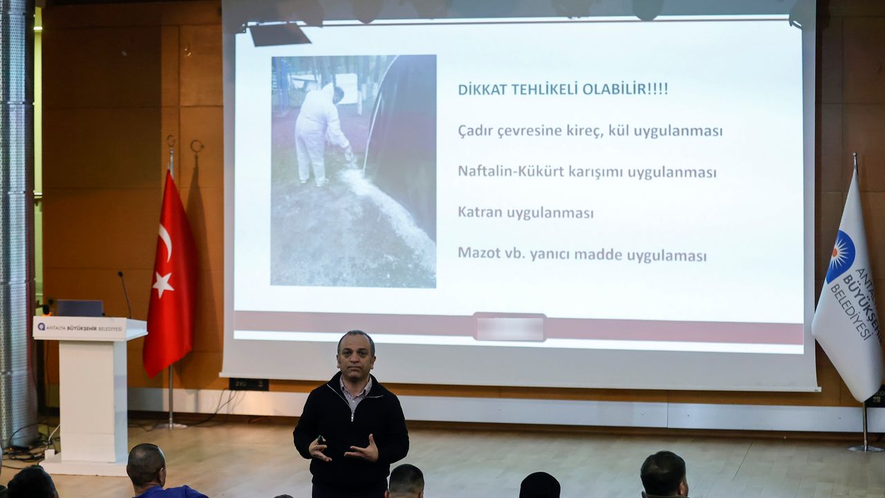 Antalya Büyükşehir Belediyesi, vektör ve haşerelerle mücadele çalışmaları kapsamında bünyesinde görev yapan ilaçlama personeline biyosidal ürün kullanımı eğitimi verdi. Eğitimin ardından sahada görev alan Çevre Sağlığı Şube Müdürlüğü personeline "Biyosidal Ürün Uygulayıcı Sertifikası" verildi