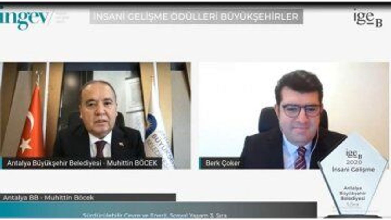 İNSANI Gelişme Vakfı (İNGEV) yerel ölçekte insani gelişmeyi desteklemek üzere 3 yıldır sürdürdüğü İGE- İlçeler Endeksini bu yıl ilk kez Büyükşehirler ölçeğine taşıdı. İGE-Büyükşehirler 2020 sonuçları açıklandı ve insani gelişmede başarı gösteren Büyükşehir Belediye Başkanlarına çevrim içi konferans ile ödülleri verildi. Antalya Büyükşehir Belediyesi, 30 Büyükşehir Belediyesini kapsayan bu çalışmada 'İnsani Gelişme Ödülü'nde 5. sıra, 'Sürdürülebilir Çevre ve Enerji ile Sosyal Yaşam' kategorilerinde de 3. sırada yer aldı.