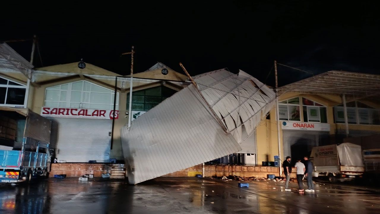 Antalya'nın Demre ilçesinde meydana gelen hortum nedeniyle toptancı halindeki bir işyerinin çatısı zarar gördü, Kaş ilçesinde de sağanak etkili oldu