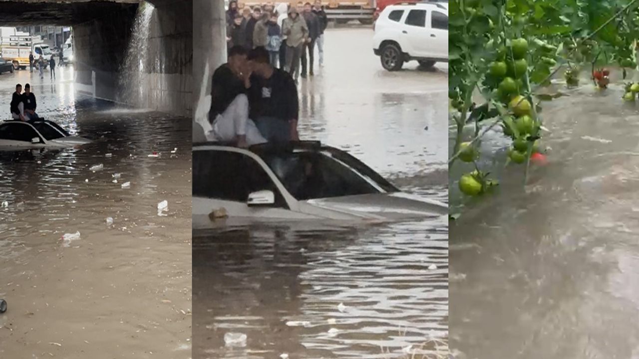 Batı ilçelerinden Demre'de etkili olan sağanak nedeniyle bazı noktalar adeta göle döndü, seraları su bastı.