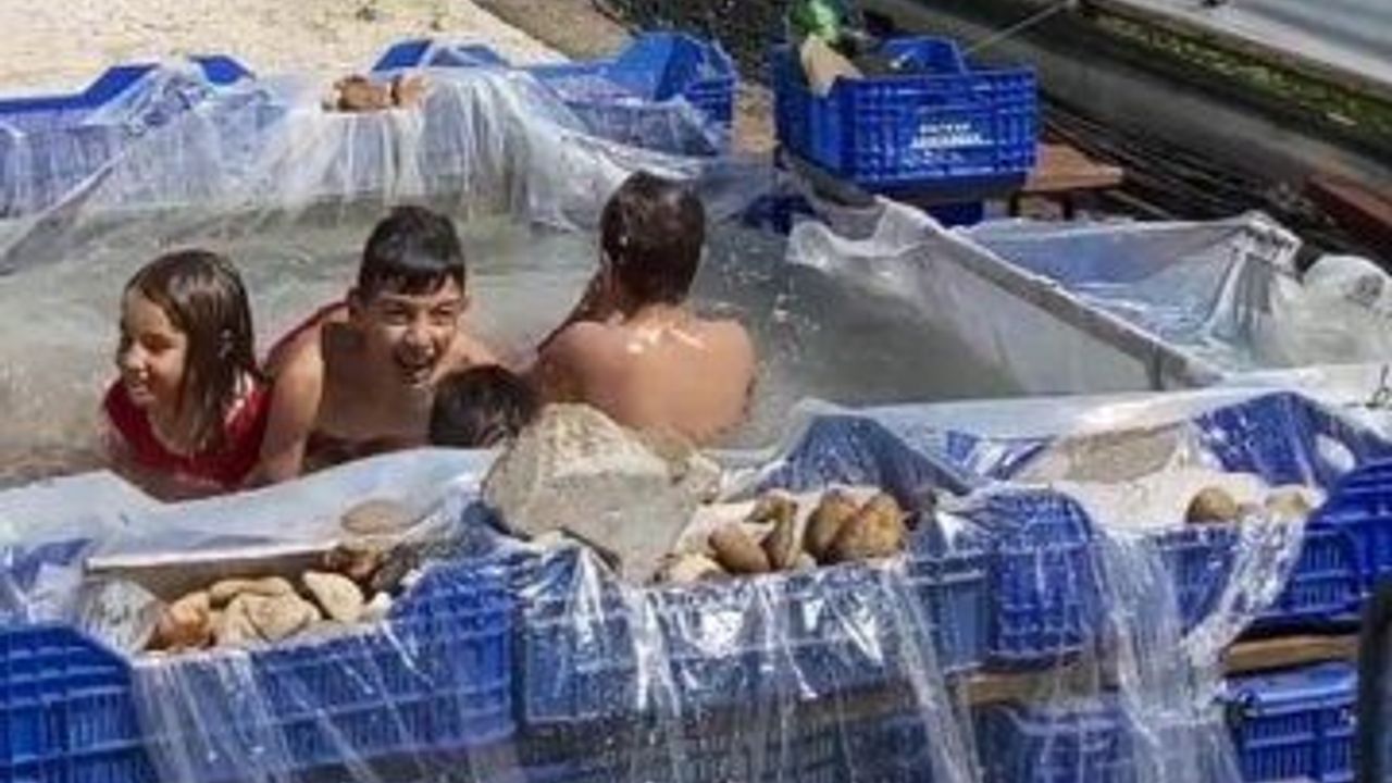 Antalya'nın Serik ilçesinde 4 çocuğun domates kasası ve naylondan yaptıkları havuzda yüzmesi renkli görüntüler oluşturdu