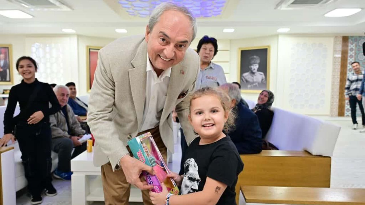 Minik Defne daha sonra annesi Kübra Duman ile beraber Başkan Kocagöz’e Atatürk çiçeği hediye etti.