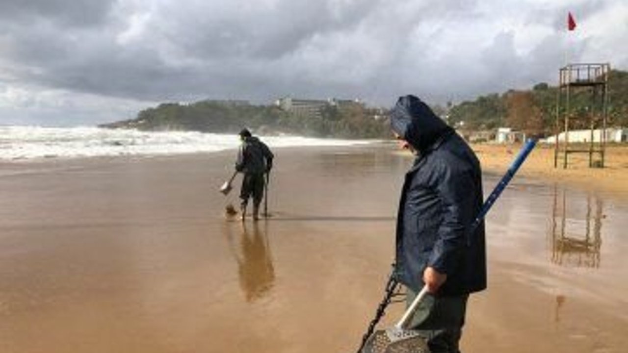 ANTALYA'da son iki gündür etkisini gösteren fırtınada denizde de büyük dalgalar oluştu. Havanın normale dönmesiyle beraber değerli eşya arayanlar sahilleri taramaya başladı. Antalya'nın Alanya ilçesinde bulunan İncekum plajında da iki kişi ellerindeki dedektörlerle değerli eşya aradı. Sahili boydan boya didik didik tarayan defineciler umutla bir şeyler bulmayı denedi.