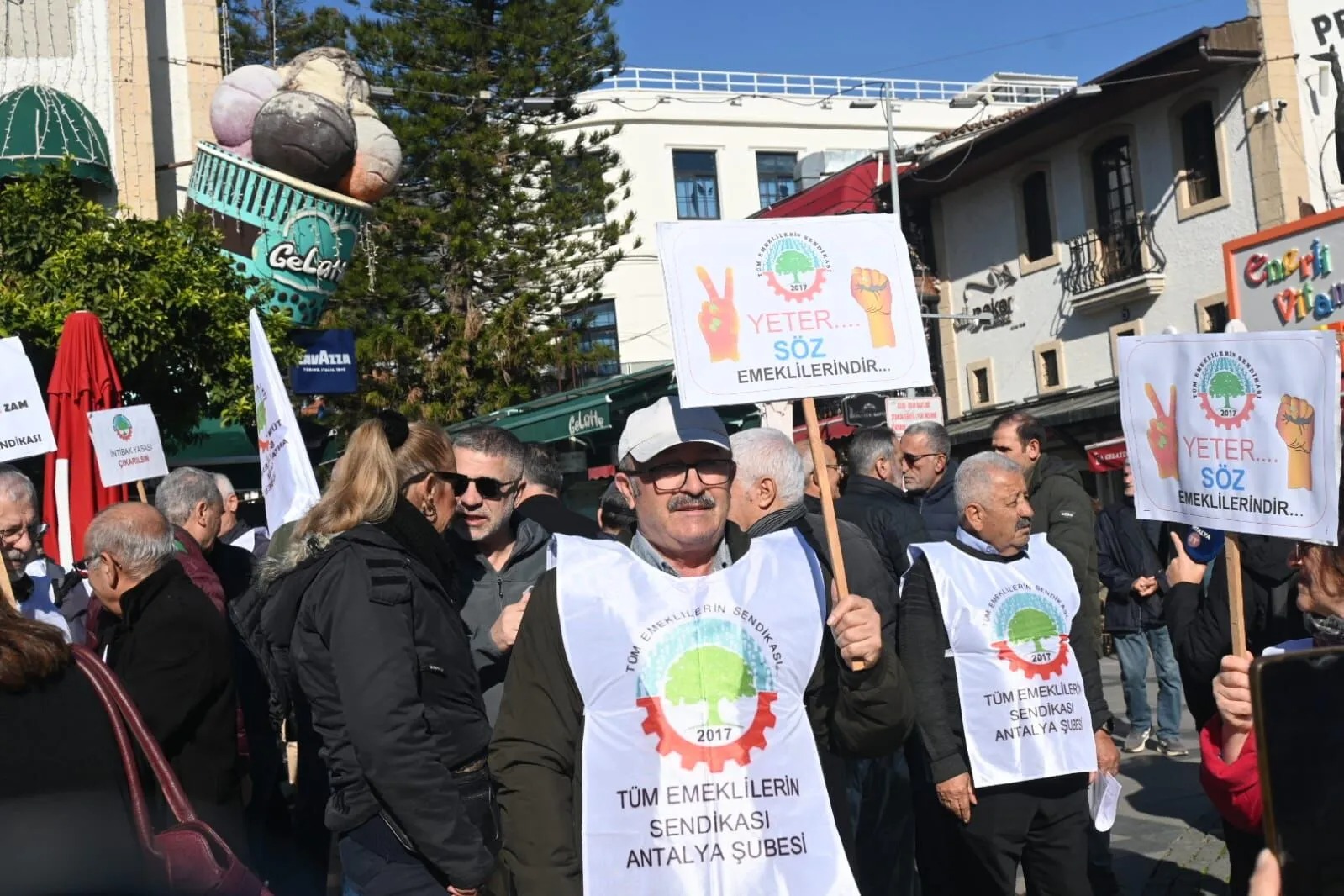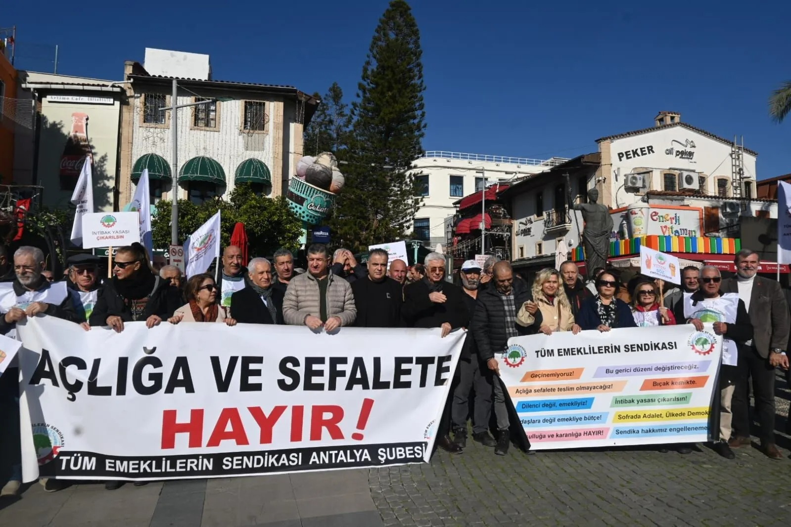 Bu tabloya dikkat çekmek ve taleplerini kamuoyuna duyurmak isteyen Tüm Emekliler Sendikası Antalya Şubesi, Attalos Meydanı’nda bir araya gelerek “Sadaka değil, hakkımızı istiyoruz”, “Aylıklara 20 bin TL seyyanen zam şart" ve “Örgütlen, diren değiştir” sloganları ile düşük maaşlara ekonomik tepkilerini dile getirdi. Attalos Meydanı’nda eylem gerektiren emeklilere ise CHP Antalya İl Başkanı Nail Kamacı ve CHP Antalya Milletvekili Cavit Arı destek verdi.