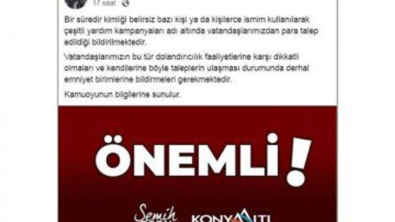 KONYAALTI Belediye Başkanı Semih Esen, sosyal medya hesabından vatandaşlara uyarıda bulundu. Bir süredir kimliği belirsiz kişi ya da kişilerce isminin kullanılarak çeşitli yardım kampanyaları adı altında vatandaşlardan para talep edildiğini belirten Esen, 'Vatandaşlarımızın bu tür dolandırıcılık faaliyetlerine karşı dikkatli olmaları ve kendilerine böyle taleplerin ulaşması durumunda derhal emniyet birimlerine bildirmeleri gerekmektedir' dedi. (DHA)