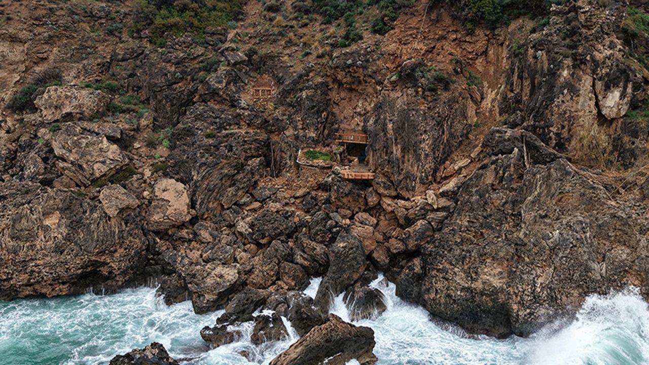 Antalya kıyılarında birçok noktada hobi amaçlı dalışlar yapan ve sanal medyada paylaşan Hüseyin Fırat, ilk olarak geçen günlerde, yüksekliği 40 metreyi bulan falezlerin bulunduğu Konyaaltı Caddesi bölgesinde yaptığı dalış sırasında, kayalıklar arasında beton fark etti. Kayalıklardan tırmanan Fırat, falezlerin üzerinde kaçak betonarme yapı ile karşılaştı. Denize kadar inen demir ve beton merdivenlerden çıkan Fırat, beton duvarlar ve demir kapı olduğunu gördü. Demir kapıdaki delikten görüntü alan Fırat, içeride kano, sandalyeler, duş ve av malzemeleri bulunan bir oda ve karayla bağlantılı olduğu düşünülen merdivenleri görüntüledi.