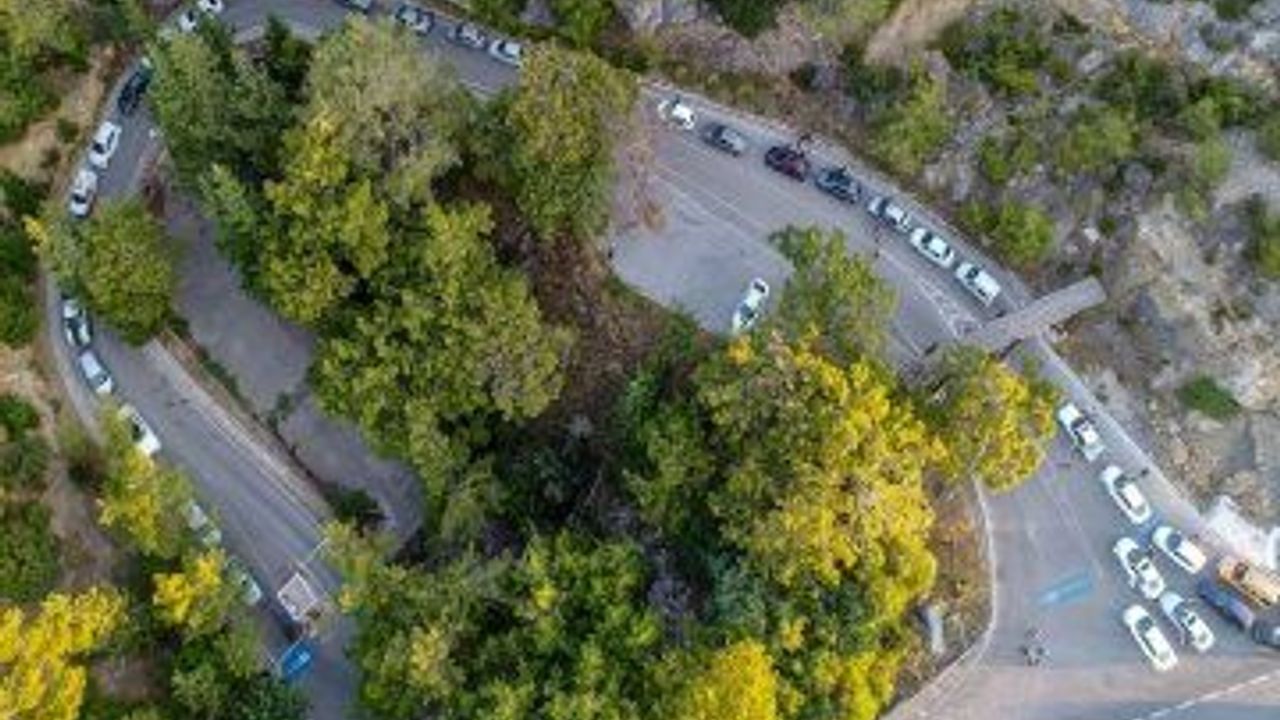 Antalya'da Topçam Mesire Alanı'na gelen vatandaşlar, araçlarıyla 1 kilometrelik kuyruk oluşturdu. Araç kuyruğu havadan görüntülenirken mesire alanına 1 saatte 215 araç ve 860 kişi giriş yaptı