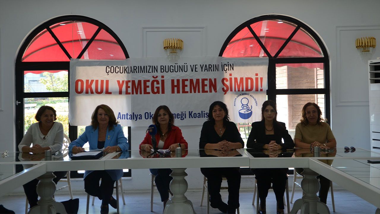 Antalya Okul Yemeği Koalisyonu bileşenleri Antalya Gazeteciler Cemiyeti Lokali’nde ‘Her çocuğa bir öğün okul yemeği, her okula temiz su” için bir basın açıklaması düzenledi. Antalya Okul Yemeği Koalisyonu temsilcileri, okul yemeği eylemleri kapsamında çocukların ücretsiz, sağlıklı ve besleyici öğünlere erişim hakkını savundu.