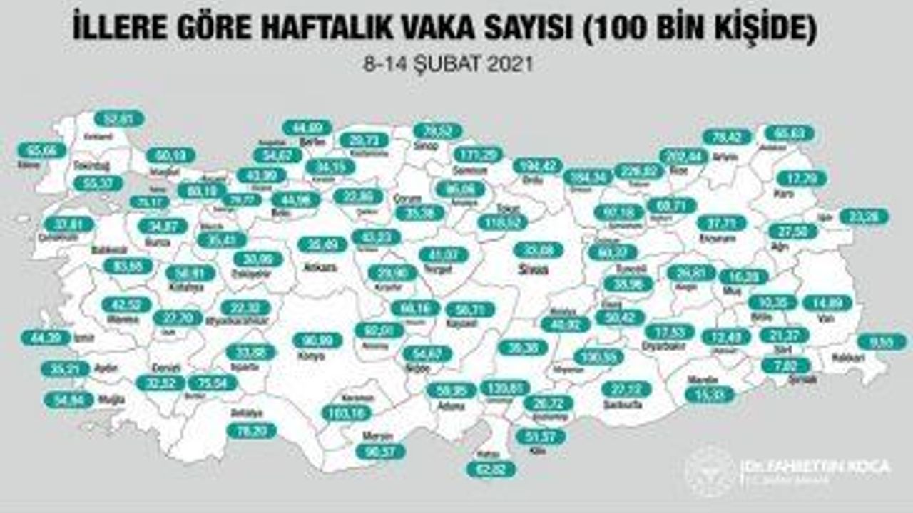 SAĞLIK Bakanı Fahrettin Koca, sosyal medya hesabından il bazında 7 günlük covid-19 vaka sayılarını açıkladı. Koca, paylaşımında 'Son basın toplantımızda illerimizdeki vaka sayısını paylaşacağımızı belirtmiştim. Bundan sonra her hafta başında 7 günün vaka sayısını ilan edeceğiz. Yerinde karar dönemindeyiz' ifadelerine yer verdi. Ayrıca, covid19.saglik.gov.tr' adresinden paylaşılan tabloya göre, 8-14 Şubat 2021 tarihleri arasında Covid-19 vaka sayısında ilk üç il Trabzon, Rize ve Ordu oldu. Diğer illerdeki 7 günlük vaka sayıları ise şu şekilde: 'Adana 59,95, Adıyaman 100,55, Afyon 22,32, Ağrı 27,50 Aksaray 92,01, Amasya 96,06, Ankara 35,49, Antalya 78,20, Ardahan 65,63, Artvin 78,42, Aydın 35,21, Balıkesir 83,65, Bartın 44,69, Batman 12,49, Bayburt 60,71, Bilecik 35,41, Bingöl 26,81, Bitlis 10,35, Bolu 44,96, Burdur 75,54, Bursa 34,87, Çanakkale 37,61, Çankırı 22,86, Çorum 35,36, Denizli 32,52, Diyarbakır 17,53, Düzce 43,99, Edirne 65,66, Elazığ 50,42, Erzincan 60,37, Erzurum 37,71, Eskişehir 30,99, Gaziantep 26,72, Giresun 184,34, Gümüşhane 97,18, Hakkari 9,55, Hatay 62,82, Iğdır 23,28, Isparta 33,88, İstanbul 60,19, İzmir 44,39, Kahramanmaraş 39,38, Karabük 34,15, Karaman 103,16, Kars 17,79, Kastamonu 29,73, Kayseri 56,71, Kırıkkale 43,23, Kırklareli 52,61, Kırşehir 29,90, Kilis 51,57, Kocaeli 88,19, Konya 90,99, Kütahya 50,91, Malatya 40,92, Manisa 42,52, Mardin 15,33, Mersin 90,57, Muğla 54,94, Muş 16,28, Nevşehir 66,16, Niğde 54,67, Ordu 194,42, Osmaniye 139,81, Rize 202,44, Sakarya 76,77, Samsun 171,29, Siirt 21,37, Sinop 79,52, Sivas 33,08, Şanlıurfa 27,12, Şırnak 7,82, Tekirdağ 55,37, Tokat 118,52, Trabzon 228,02, Tunceli 38,96, Uşak 27,70, Van 14,89, Yalova 75,17, Yozgat 41,07, Zonguldak 54,67.' (İHA)