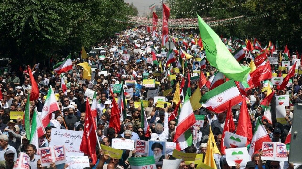Gösteride "Kahrolsun İsrail", "Kahrolsun ABD", "Sonuna kadar direneceğiz", "Siyonist rejim yok olacak" ve "Liderime canım feda" yazılı pankartlarla tepkilerini dile getiren halk, "Hamaney'le çatışan herkes sonunda yok olup gitti", "İran Gazze olmayacak", "Liderimizin arkasındayız" ve "Nükleer silah hakkımız" sloganları attı.