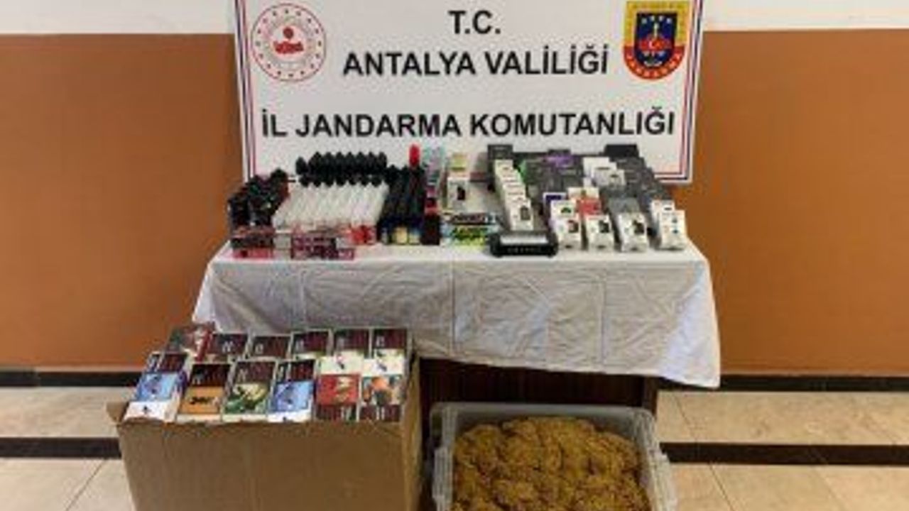 ANTALYA'nın Alanya ilçesinde jandarma ekipleri bir iş yerine düzenlenen baskında piyasa değeri 100 bin lira olan elektronik sigara, elektronik sigara likidi, kıyılmış tütün ve makaron ele geçirildi.