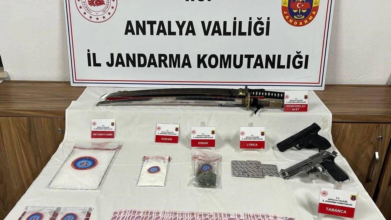 Antalya İl Jandarma Komutanlığınca yürütülen çalışmalar sonucu, Antalya Cumhuriyet Başsavcılığı talimatlarıyla Döşemealtı ilçesinde operasyon düzenlendi. İl Jandarma Komutanlığı Narkotik Şube Müdürlüğü, İstihbarat Şube Müdürlüğü ve Döşemealtı İlçe Jandarma Komutanlığı ekiplerinin müşterek aramasında şüphelinin evinde 1 kilo 374 gram metamfetamin, 84 gram kokain, 127 gram esrar, 36 adet uyuşturucu hap, 2 tabanca, 2 kılıç ve suçtan elde edildiği değerlendirilen 9 bin lira ele geçirildi.