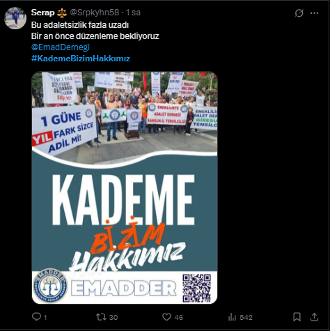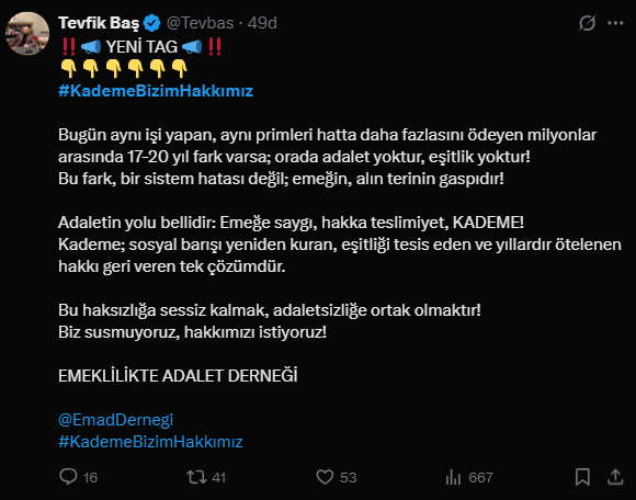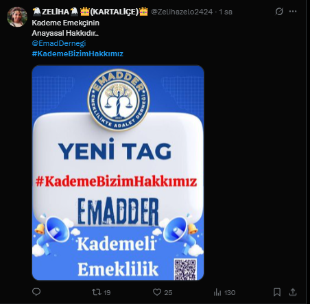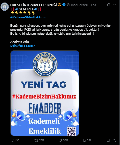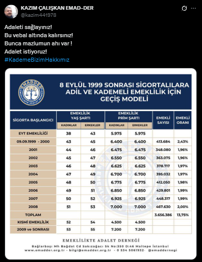 Adaletin sağlanmasının tek yolunun kademeli emeklilik olduğunu ifade eden EMADDER, " Adaletin yolu bellidir" dedi. Paylaşımda "Emeğe saygı, hakka teslimiyet kademe" sözlerine yer verilirken, "Kademe; sosyal barışı yeniden kuran, eşitliği tesis eden ve yıllardır ötelenen hakkı geri veren tek çözümdür. Bu haksızlığa sessiz kalmak, adaletsizliğe ortak olmaktır. Biz susmuyoruz, hakkımızı istiyoruz" denilerek destek talebinde bulunuldu.