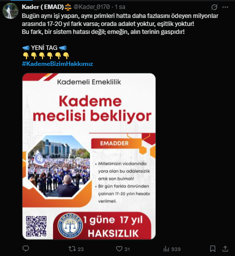 EMADDER'İN başlattığı '#KademeBizimHakkımız' hashtag çalışmasına binlerce kişi destek oldu. '#KademeBizimHakkımız' hashtag'ı X gündeminde ilk sıralara yükselirken kademeli emeklilik bekleyen binlerce kişi de taleplerini yetkililere duyurmak için paylaşım yaptı.