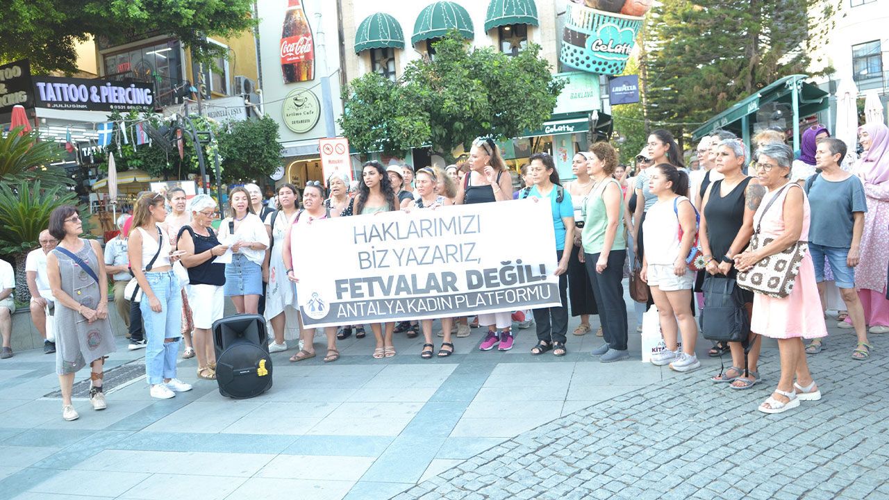 Antalya Kadın Platformu, Diyanet İşleri Başkanlığı’nın 15 Ağustos’ta okutulan hutbesinde kız çocuklarının mirastan erkeklerin yarısı kadar pay almasının ‘ilahi adalet’ ifadelerini Kaleiçi’ndeki Attalos Heykeli önünde toplanarak protesto etti. Platform açıklamanın Anayasa’ya ve Türk Medeni Kanunu’na aykırı olduğunu dile getirdi.