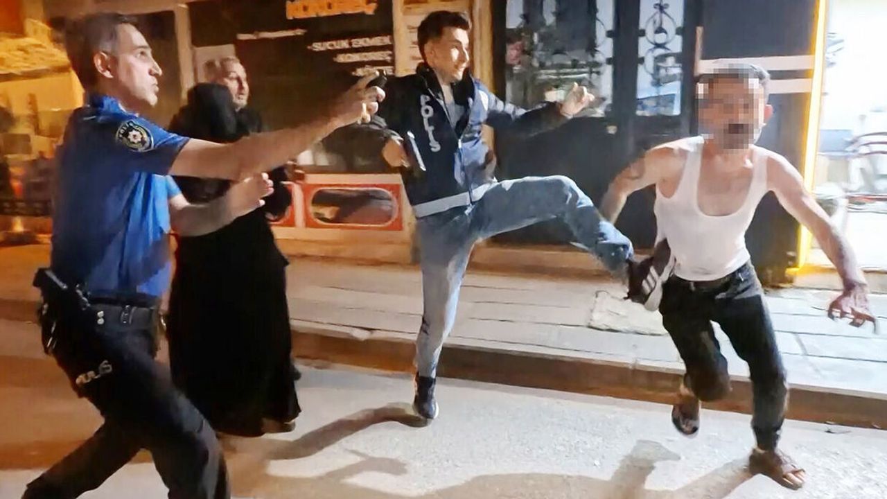 Kısa sürede adrese gelen bekçi ve polis ekipleri kavgaya müdahale edip ayırmak istedi. Tuncer Ç. ile oğlu Mustafa Samet Ç. polislerin müdahalesiyle durdurulurken, Ali A. ile oğlu Mustafa A. husumetlilerini bırakıp polis memurlarına saldırmaya başladı. Mustafa A. elindeki sandalye ile polis memurunun koluna vurup yaralarken, babası Ali A. ise elindeki bıçakla önce çevredeki vatandaşlara, sonra da polis memuruna saldırdı. Yüreklerin ağza geldiği o anlar anbean İhlas Haber Ajansı (İHA) kamerasına yansıdı. Polis ve bekçilerin biber gazı ile müdahale ettiği olayda elindeki bıçağı bir türlü bırakmayarak herkese saldıran baba Ali A., İHA muhabirinin üzerine de koşarak bıçakla saldırdı. Gözü dönmüş baba bir ara elindeki bıçağı polislerin üzerine fırlattı.