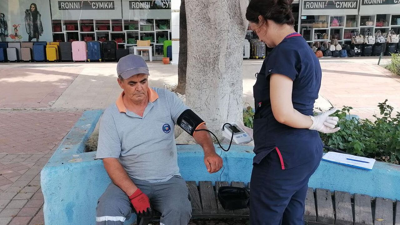 Kemer Belediyesi Sağlık İşleri Müdürlüğü tarafından başlatılan proje kapsamında görevlendirilen bir hemşire eşliğinde sıcak havalarda sahada çalışan Kemer Belediyesi Temizlik İşleri personelinin tansiyonu ölçülüyor, güneş çarpması konusunda bilgilendirme yapılıyor.