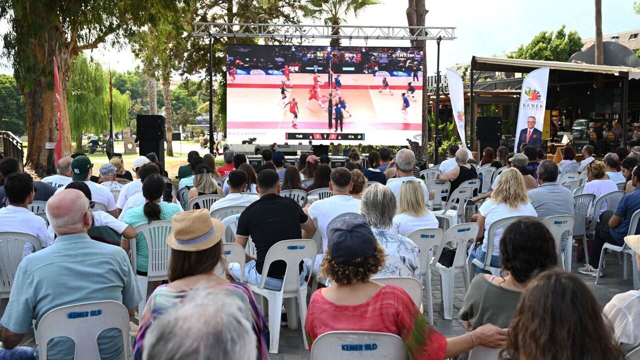 Mustafa Ertuğrul Aker Parkı'nda yer alan Kemer Belediyesi Deniz Kafe yanında kurulan dev ekrandaki A Milli Kadın Voleybol Takımı'nın İtalya ile oynadığı maçı, Kemer Belediye Başkanı Necati Topaloğlu, Kemer Belediye Başkan Yardımcıları Semih Top, Mehmet Derya Baytekin, Kemer Belediye Meclis Üyesi Cansın Efir, Kemer Belediyesi Gençlik Meclisi Başkanı Mehmet Yalın Erdal ve birim müdürleri, vatandaşlarla birlikte izledi.