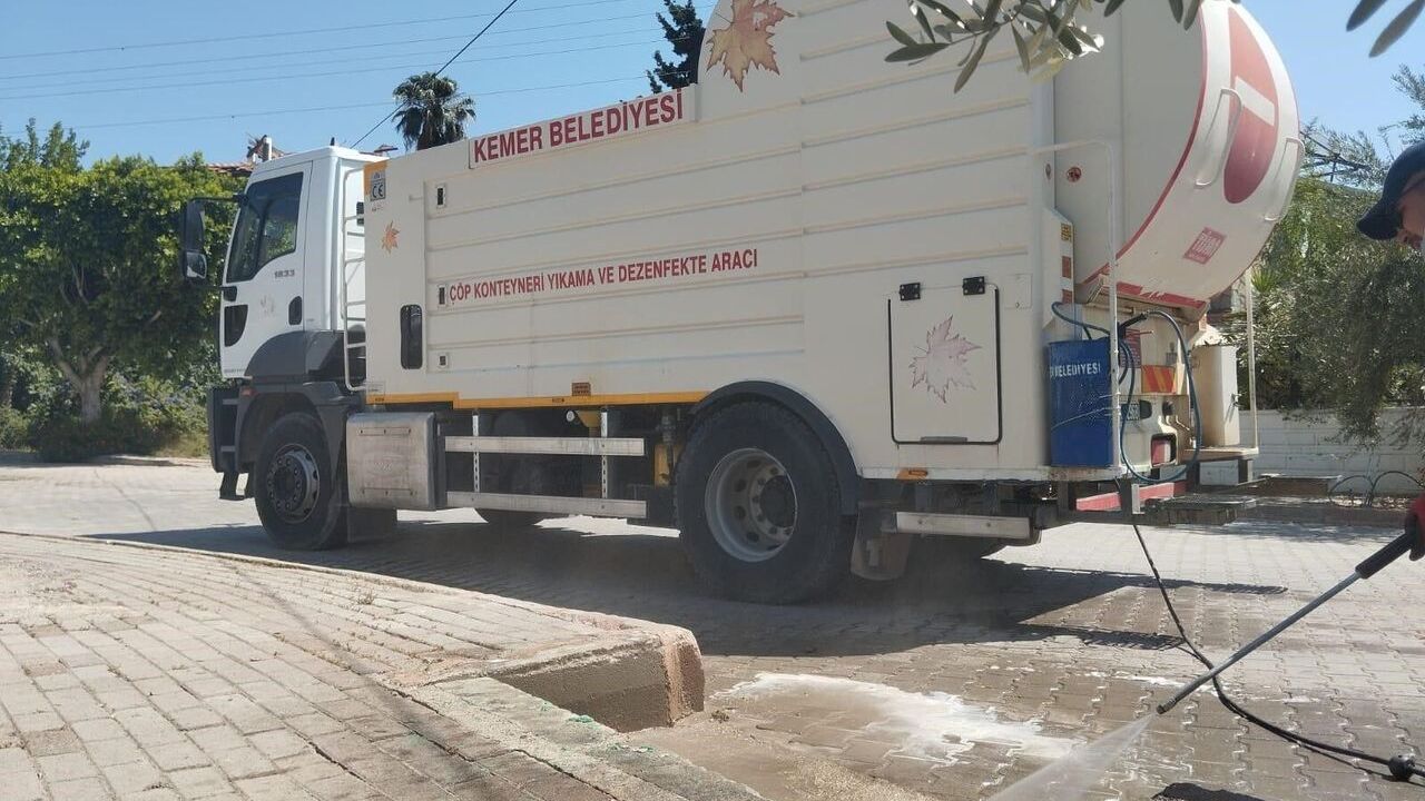 Kemer'in tüm mahallelerinde yoğun şekilde temizlik çalışmalarına devam eden belediye ekipleri, rutin olarak yaptığı mıntıka temizliğinin yanı sıra çöp konteynerlerini de yıkadıktan sonra dezenfekte ediyor.