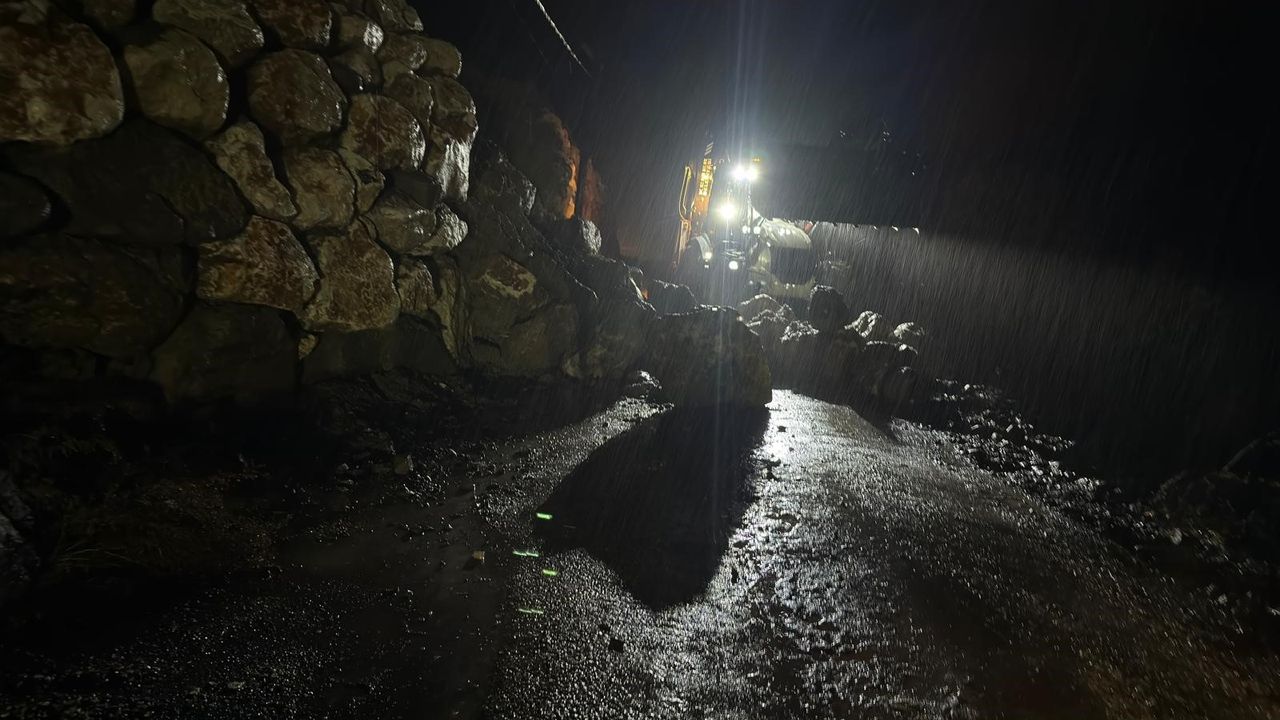Kemer Belediye Fen İşleri Müdürlüğü ekipleri, istinat duvarının çöktüğü bölgeye ulaşarak trafiğe kapanan yolu belediye araçlarıyla açtı.