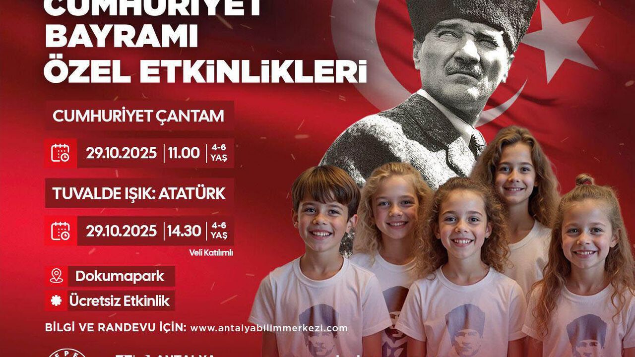 Kepez Belediyesi’nin Cumhuriyet Bayramı kutlamaları, 28 Ekim Salı günü Dokumapark’ta başlayacak. Saat 10.00’da 4- 6 yaş grubu çocuklar için 'Neşeli Adımlar: Atatürk ve Çocuk' konulu Masa Süsü Atölyesi düzenlenecek. Etkinlik 17.00’ye kadar sürecek ve katılım ücretsiz olacak. Aynı gün, Öğr. Gör. Ali Karagöz sunumuyla 'Atatürk ve Bilim Günü' konulu söyleşi ve atölye çalışmaları gerçekleştirilecek. 7- 14 yaş grubunun katılabileceği atölye, saat 14.30’da başlayacak.