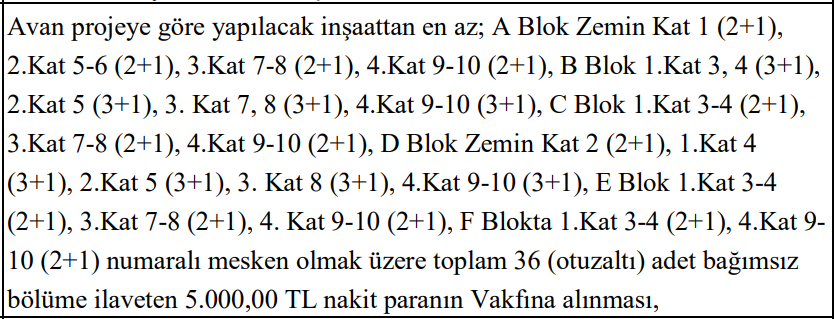Vakıflar Meclisi’nin 09.03.2026 tarihli kararı uyarınca, yüklenici tarafından idareye bırakılacak konutların blok ve daire bazlı dağılımı şu şekilde: