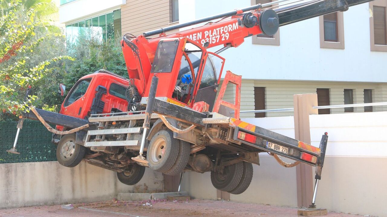 Antalya'da ağaç budaması için kiralanan ve hidroliği boşalan vinç yan yattı. Vincin devrilmesini sitenin duvarı engellerken, olay anında sepette ağaçları budamakta olan görevliyi, bulunduğu yerden itfaiye ekipleri kurtardı
