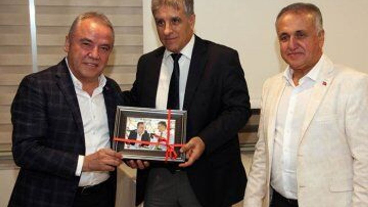 KONESKOOP Başkanı Durali Kolpak gecenin sonunda Kaymakam Keklik'e üzerinde Konyaaltı manzarasının bulunduğu plaket takdim eti. (DHA)