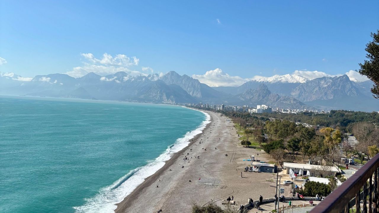 ANTALYA'NIN dünyaca ünlü Konyaaltı Sahili, açık havanın etkisiyle göz kamaştıran sahneler sundu. Çok sayıda kişi, fotoğraflarla bu güzel görüntüleri ölümsüzleştirdi. Türkiye’nin turizm üssü olan Antalya, uzun süredir kötü hava koşullarıyla mücadele ediyordu. Aralıksız süren yağışlı havalar nedeniyle çok sayıda tarım arazisi zarar gördü. Yaklaşık 10 gün süren yağışlı havaların ardından bugün kent genelinde görece daha sıcak ve açık bir hava etkili oldu.